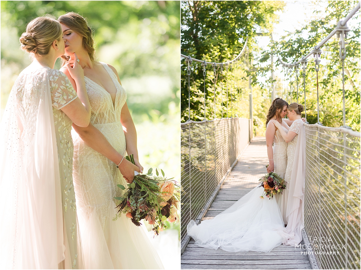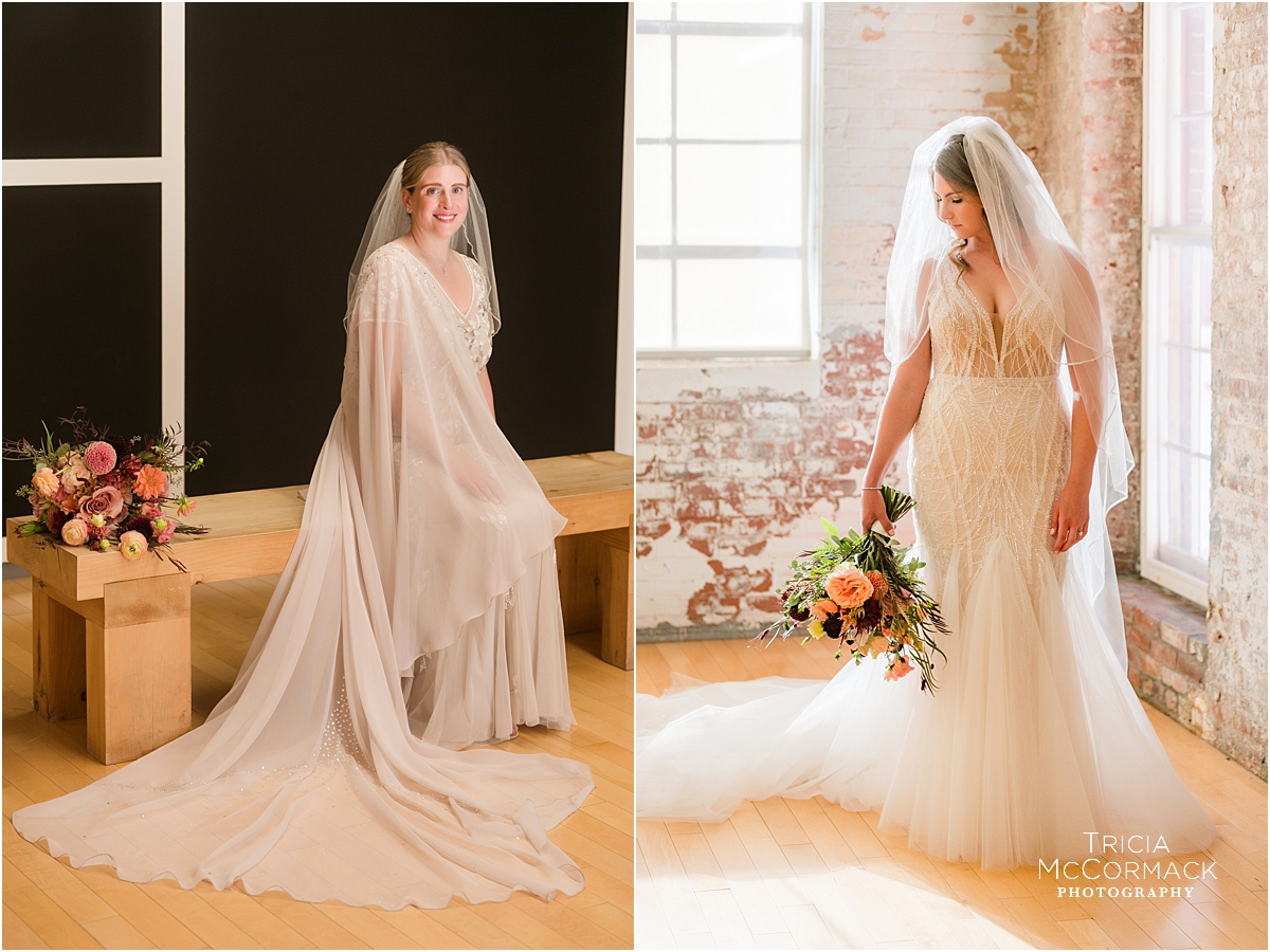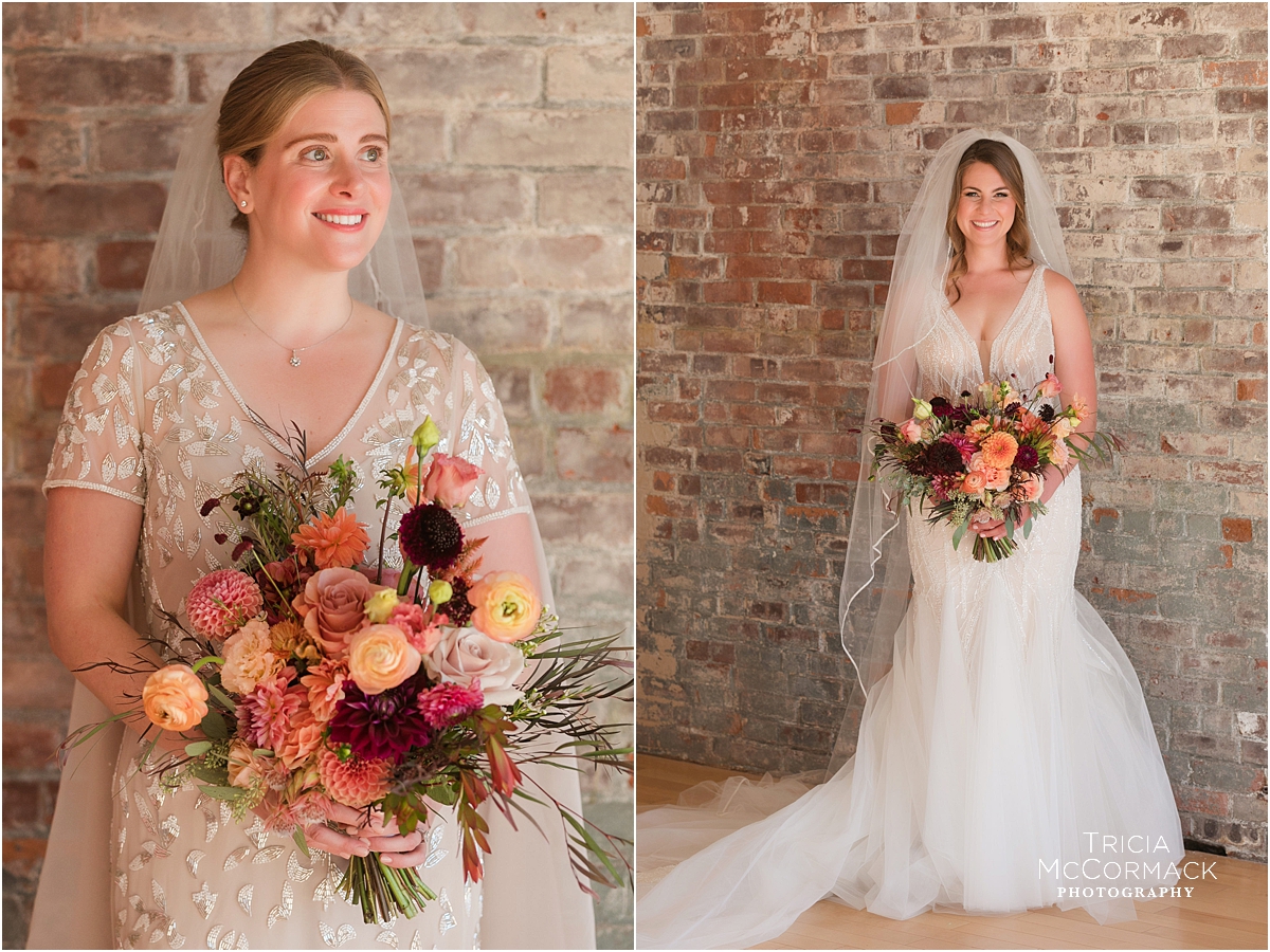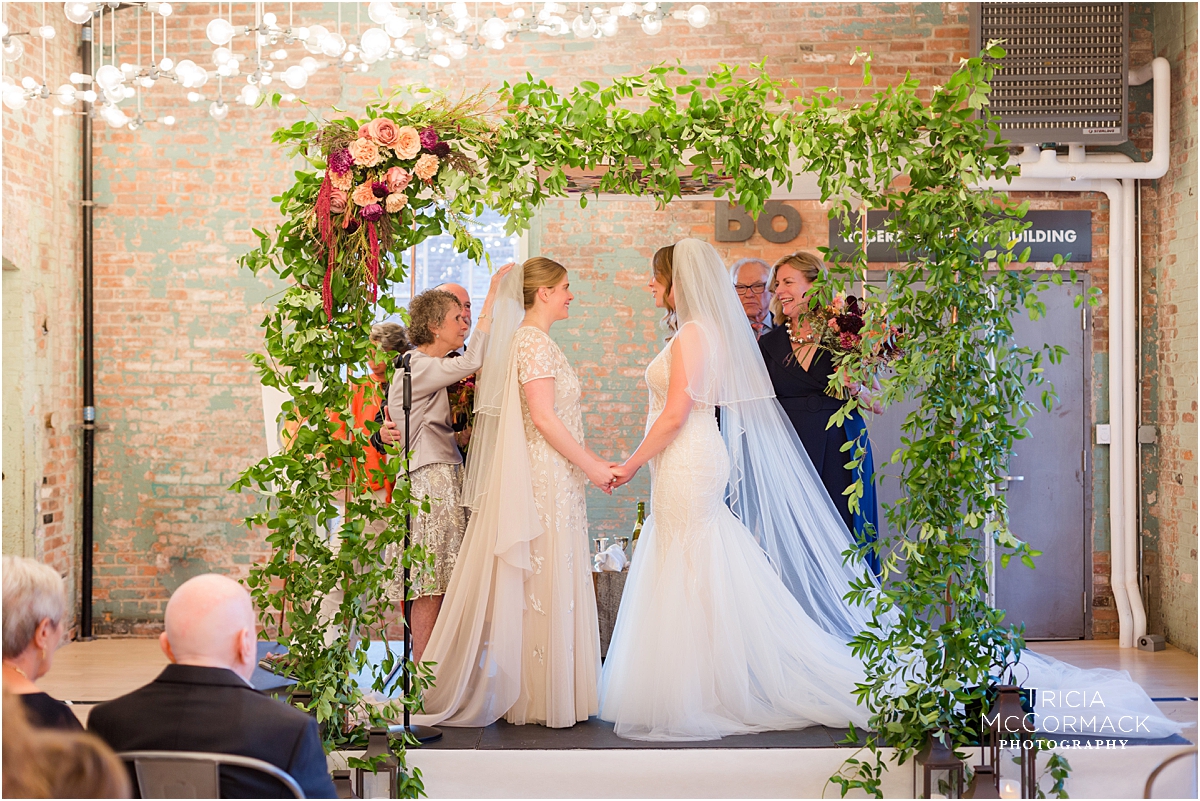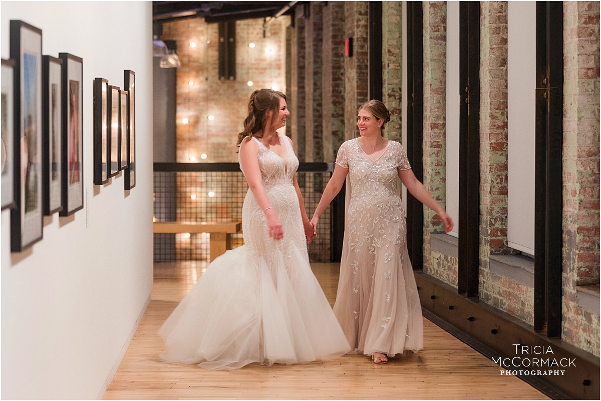 Rebecca and Marianna’s Mass MoCA wedding was fantastic. The girls opted out of a first look and instead got ready together. Enjoying time together at Tourists Hotel before helping each other get into their gowns was really something special! The genuine kindness and support they showed each other the whole morning leading up to the ceremony was also special. They continually checked in on each other to make sure the other was okay. I love that about them and this is something I also noticed during their engagement session when we all first met.